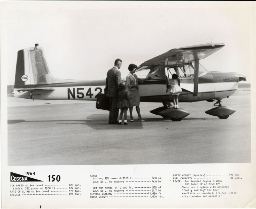 Petite famille de quatre personnes près d'un avion Cessna, mai 1964, Archives nationales à Québec, Fonds L'Action catholique, (03Q,P428,S3,SS1,D6,P14), Photographe non identifié.