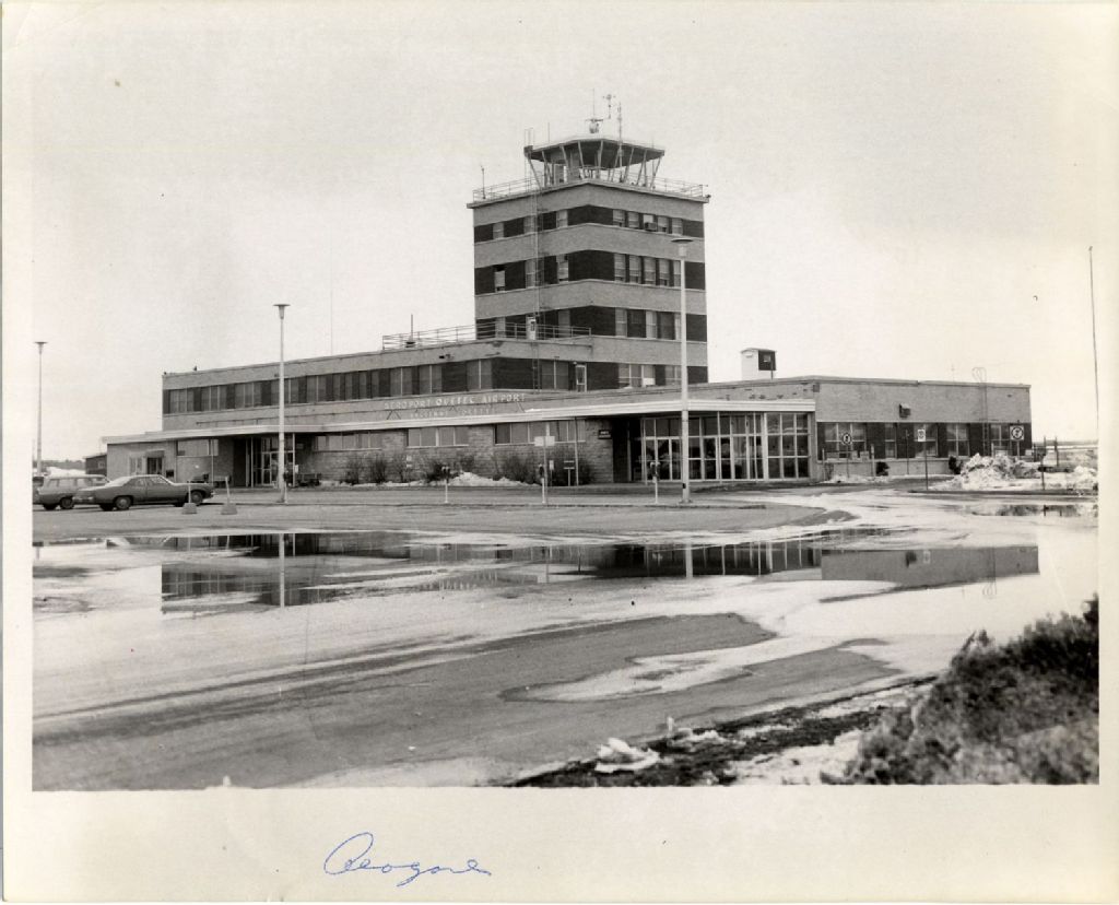 Façade et profil droit de l'aéroport de Québec en hiver, [Vers 1965], Archives nationales à Québec, Fonds L'Action catholique, (03Q,P428,S3,SS1,D6,P3), Photographe non identifié.
