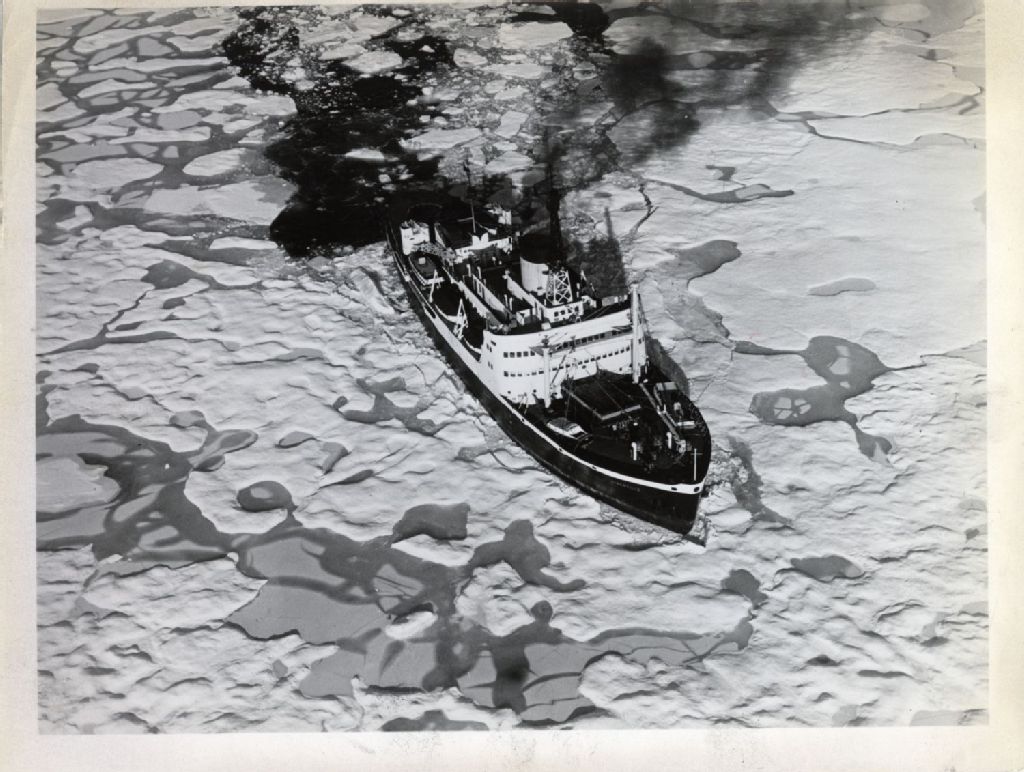 Vue aérienne du brise-glace "d'Iberville" sur l'eau en hiver, [Vers 1970], Archives nationales à Québec, Fonds L'Action catholique, (03Q,P428,S3,SS1,D7,P54), Photographe non identifié.