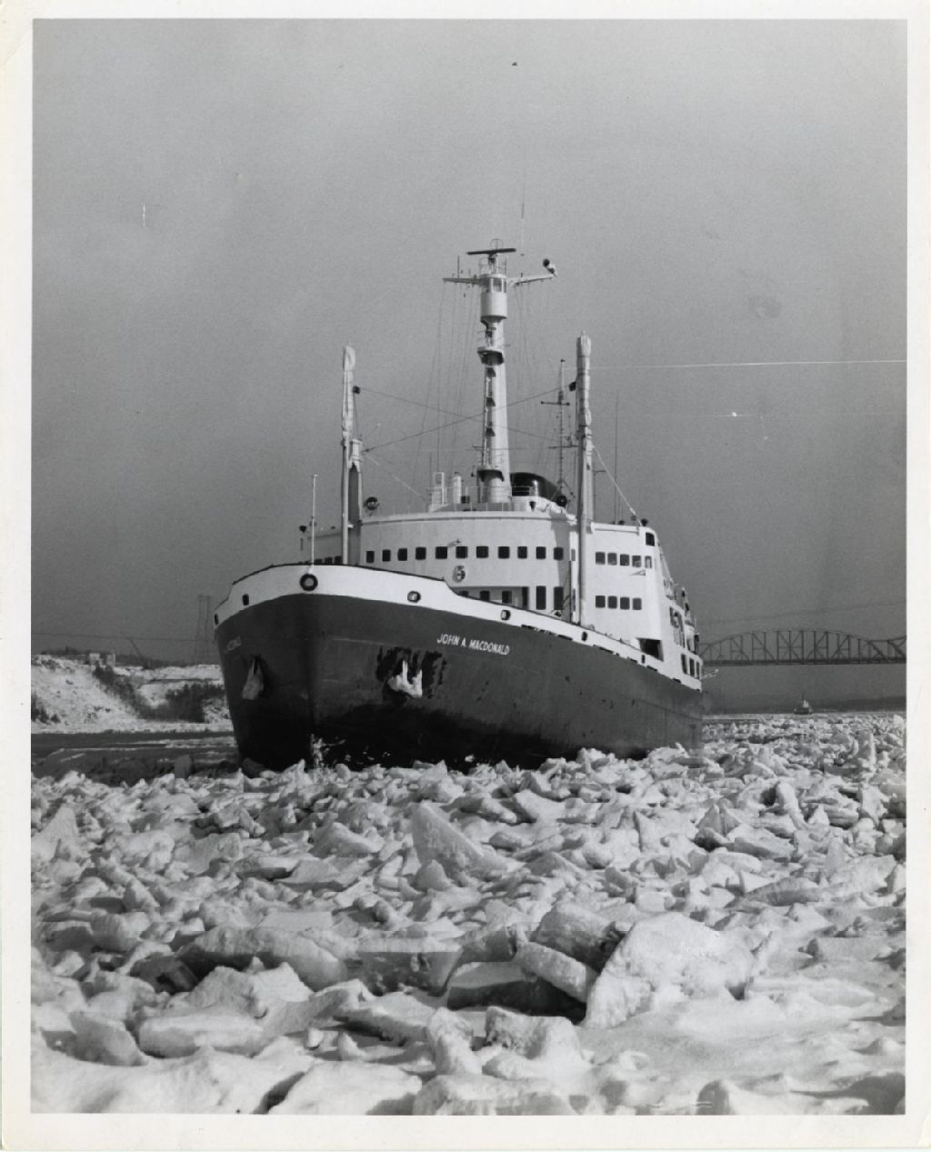 Brise-glace "John A. Macdonald" sur le fleuve Saint-Laurent à la hauteur du Pont de Québec, [Vers 1965], Archives nationales à Québec, Fonds L'Action catholique, (03Q,P428,S3,SS1,D7,P55), Photographe non identifié.