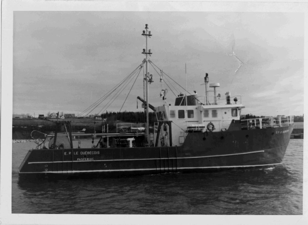 Chalutier "E. P. Québécois Paspébiac" sur le fleuve Saint-Laurent, [Vers 1970], Archives nationales à Québec, Fonds L'Action catholique, (03Q,P428,S3,SS1,D7,P93), Photographe non identifié.