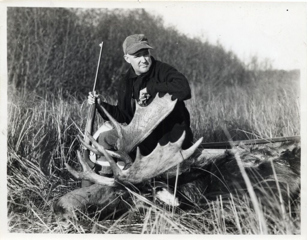 Un chasseur et son orignal abattu, [Vers 1930], Archives nationales à Québec, Fonds L'Action catholique, (03Q,P428,S3,SS1,D9,P10), Canadian National Railways.