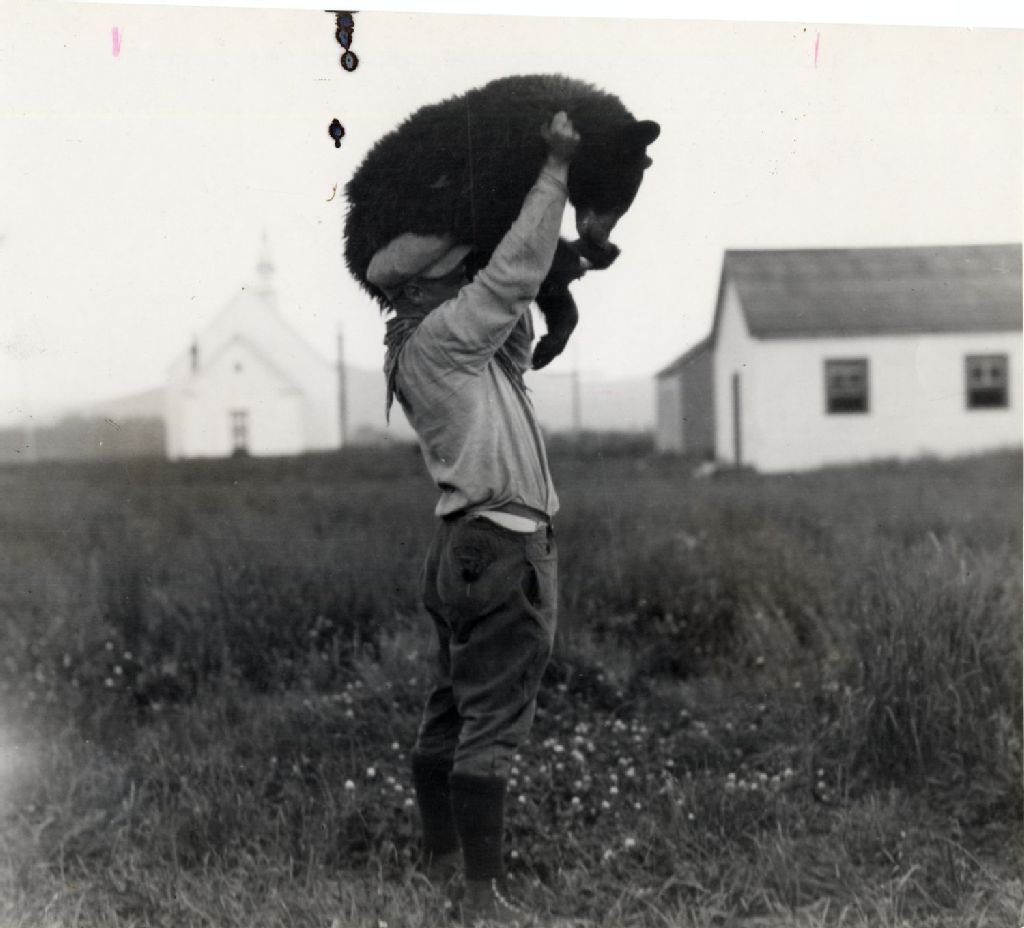 Un chasseur fier qui rapporte à la maison son ours, [Vers 1930], Archives nationales à Québec, Fonds L'Action catholique, (03Q,P428,S3,SS1,D9,P6), Canadian National Railways.