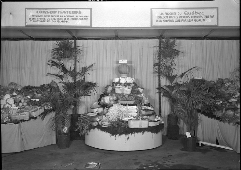 Exposition provinciale: légumes et publicités pour les produits du Québec