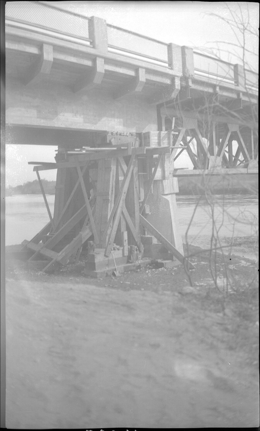 Affaissement du premier pilier du pont sur la rive droite à Ascot Corner, 1942, Archives nationales à Québec, Fonds Ministère de la Culture et des Communications, (03Q,E6,S7,SS1,D2,P11385), J.G. O'Donnell.