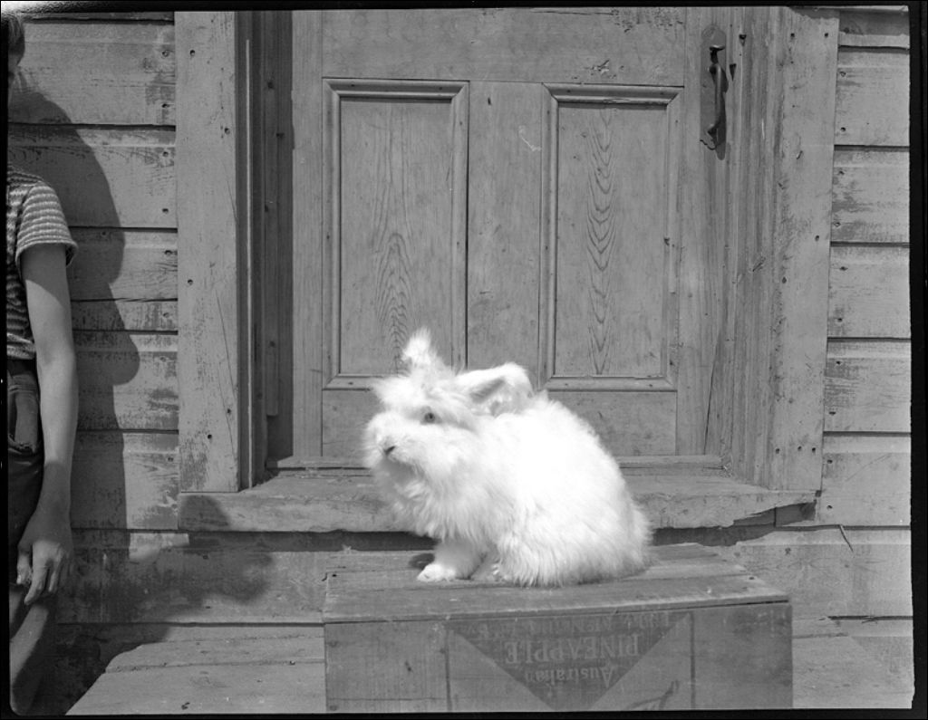 Lapin mâle angora chez le Dr Gilbert à Charny, 1943, Archives nationales à Québec, Fonds Ministère de la Culture et des Communications, (03Q,E6,S7,SS1,D2,P12358), Paul Carpentier.