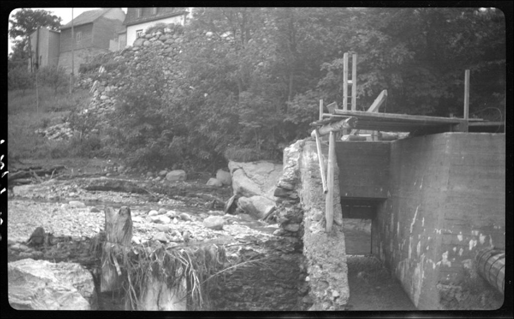 Ruines du barrage sur la rivière Blanche à Sainte-Sophie, comté de Mégantic, 1943, Archives nationales à Québec, Fonds Ministère de la Culture et des Communications, (03Q,E6,S7,SS1,D2,P12425), A.-Euclide Paré.