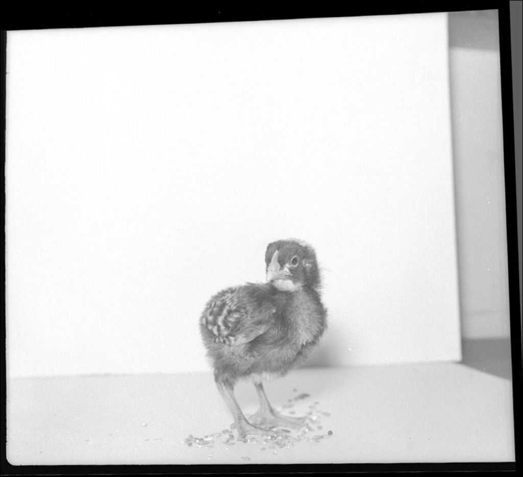 Un poussin en état d'avitaminose B2, une semaine après le début des traitements, juillet 1943, Archives nationales à Québec, Fonds Ministère de la Culture et des Communications, (03Q,E6,S7,SS1,D2,P12555), Raymond Audet.