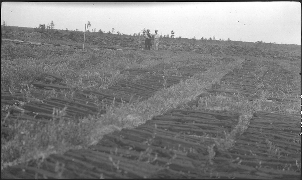 Briquettes de tourbe étendues pour le séchage à Saint-Charles, comté de Bellechasse, 1943, Archives nationales à Québec, Fonds Ministère de la Culture et des Communications, (03Q,E6,S7,SS1,D2,P12678), H. Girard.