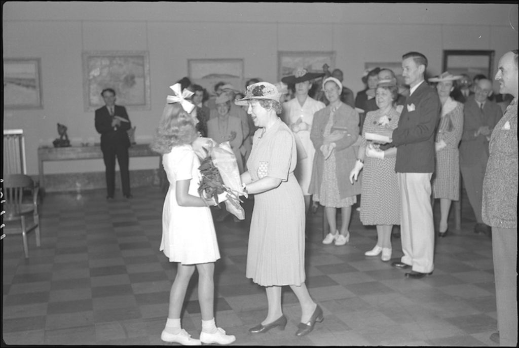Groupe à l'inauguration de l'exposition Rita Mount, Musée provincial, 1943, Archives nationales à Québec, Fonds Ministère de la Culture et des Communications, (03Q,E6,S7,SS1,D2,P12797), Paul Rainville (photo moderne).
