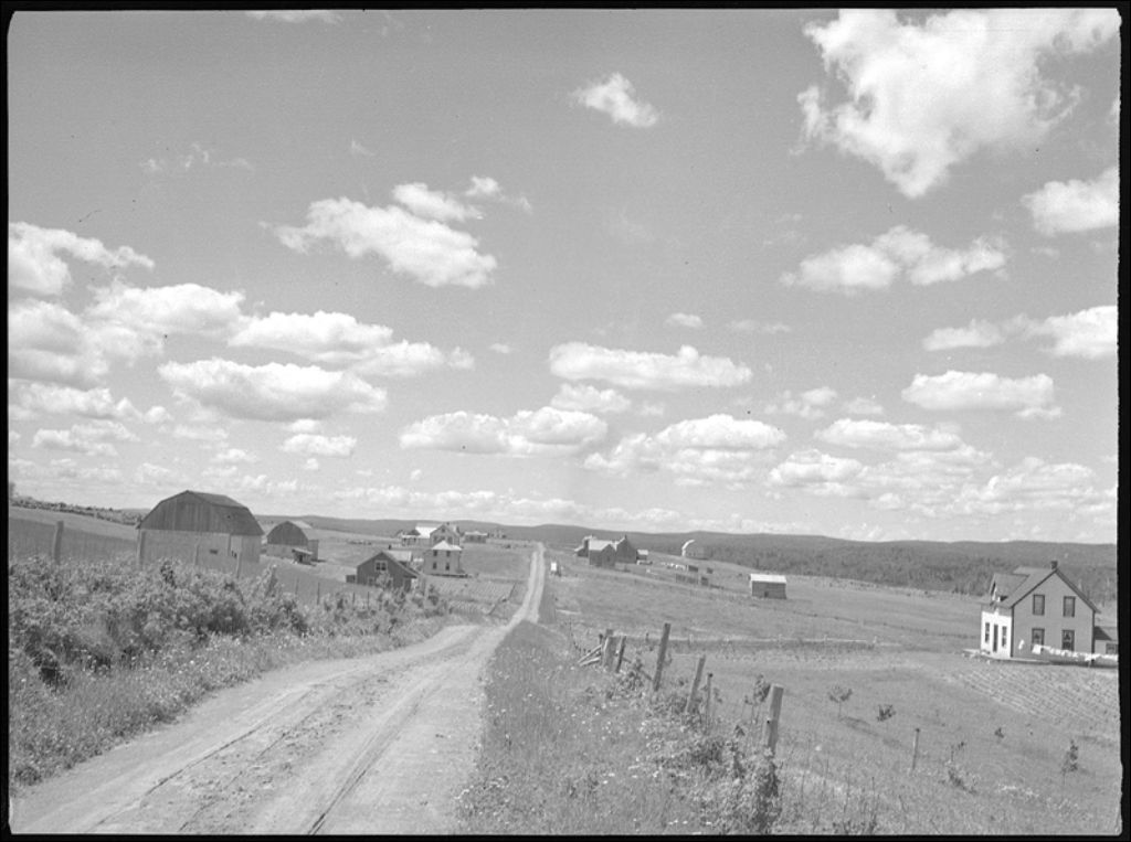 Rang double 5 et 6 au canton Nouvelle, comté de Bonaventure. À droite de la route, établissements de: Émilien Bernard, Édouard Thériault et Sidore Lavoie. À gauche de la route: Clovis Arsenault, Albert Lajoie, école, Joseph Émile Lavoie et Jacques Diotte