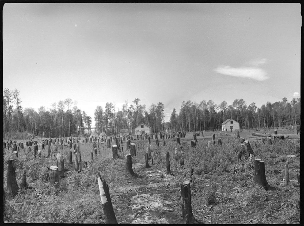 Abattis brûlé et nettoyé sur le lot de Hyppolite Poirier à l'île Nepawa (maison d'Albert Poirier à droite)