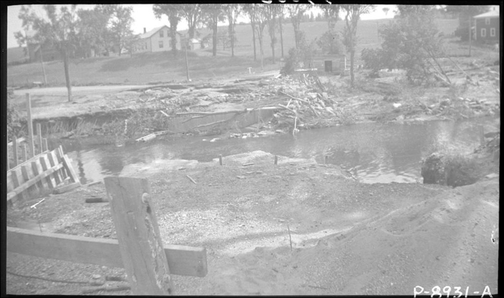 Dégâts causés par l'inondation de juin 1943 au pont sur la rivière Saumon à Lennoxville, 1943, Archives nationales à Québec, Fonds Ministère de la Culture et des Communications, (03Q,E6,S7,SS1,D2,P14053), Albert Roy.