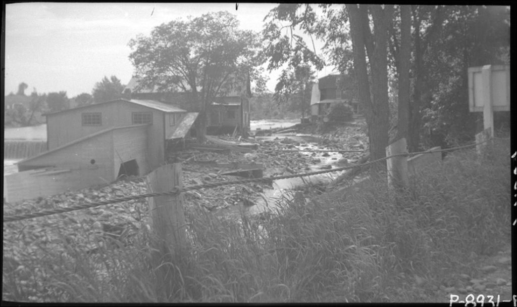 Dégâts causés par l'inondation de juin 1943 au pont sur la rivière Saumon à Lennoxville, 1943, Archives nationales à Québec, Fonds Ministère de la Culture et des Communications, (03Q,E6,S7,SS1,D2,P14054), Albert Roy.