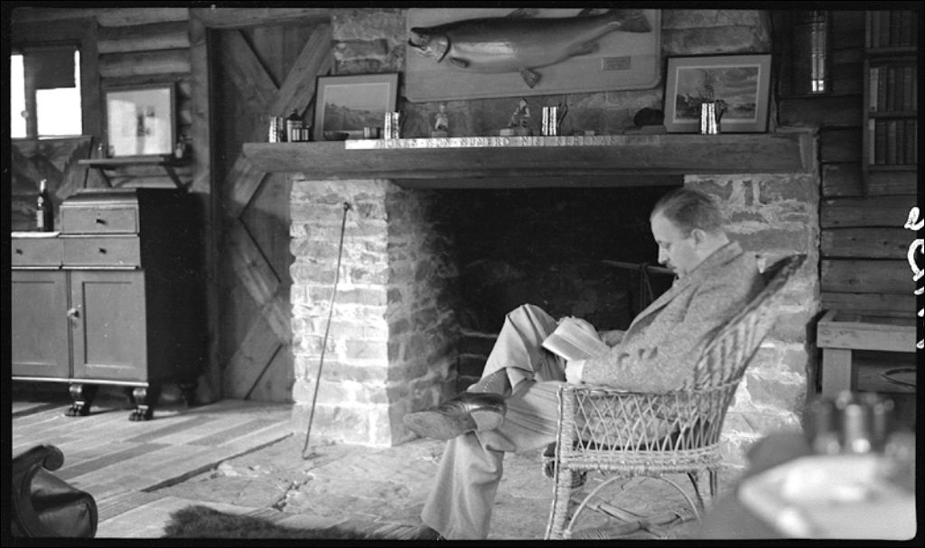 Le club Serenity à Sainte-Anne-des-Monts: l'Honorable Perreault Casgrain en face du foyer, 1943, Archives nationales à Québec, Fonds Ministère de la Culture et des Communications, (03Q,E6,S7,SS1,D2,P14136), Lionel Lebel.