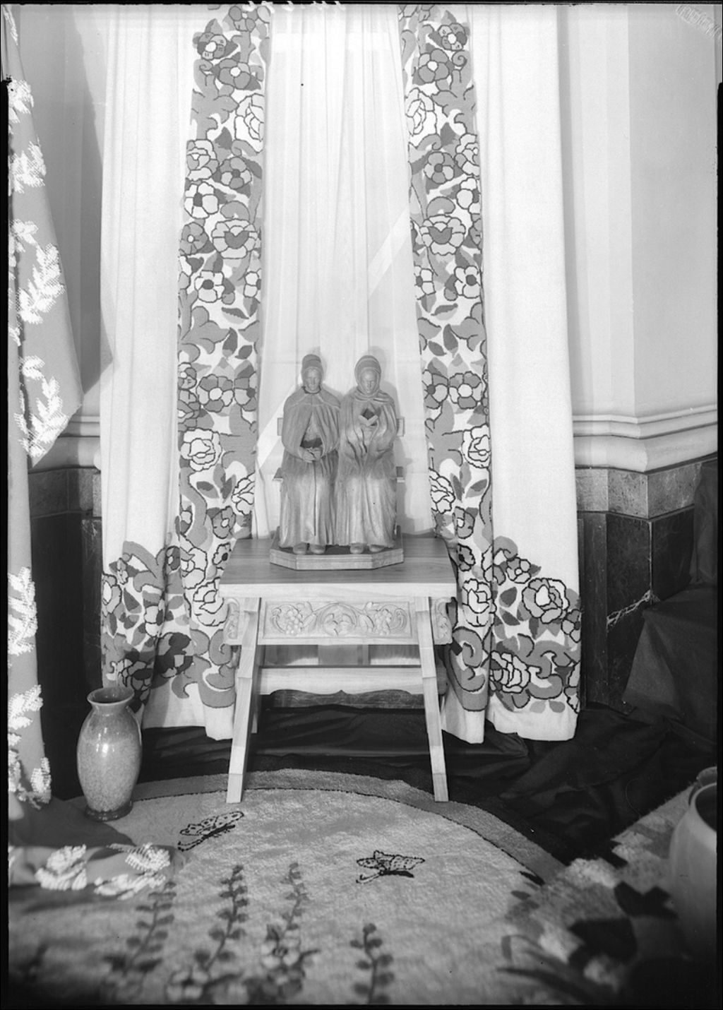 Sculpture sur bois et tentures crochetées