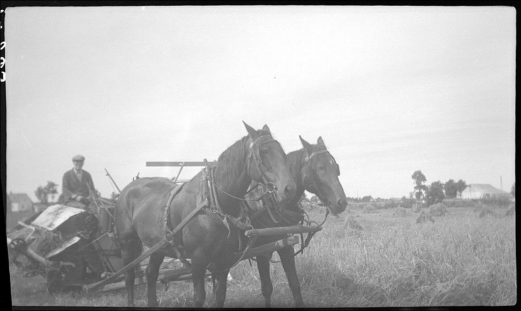 Paire de juments canadiennes attelée à une moissonneuse à Bécancour, 1943, Archives nationales à Québec, Fonds Ministère de la Culture et des Communications, (03Q,E6,S7,SS1,D2,P14863), J.P.Lettre.