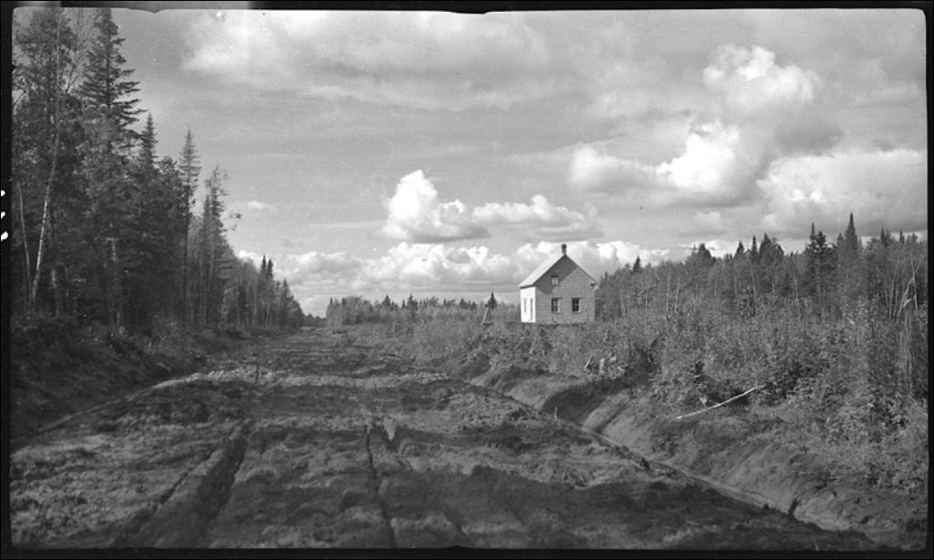 Chemin en construction à Saint-Lucien, comté de Drummond, 1943, Archives nationales à Québec, Fonds Ministère de la Culture et des Communications, (03Q,E6,S7,SS1,D2,P15917), Irénée Beaudet.