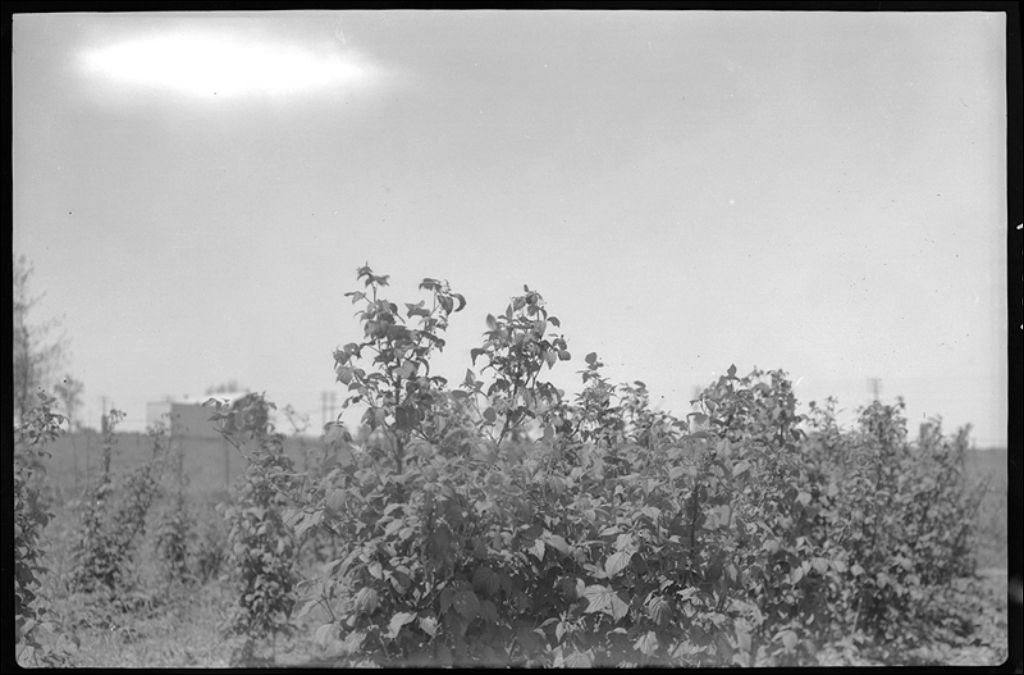 Plant de framboisier non ravagé dans un champ infesté de hannetons à l'île Jésus, comté de Laval