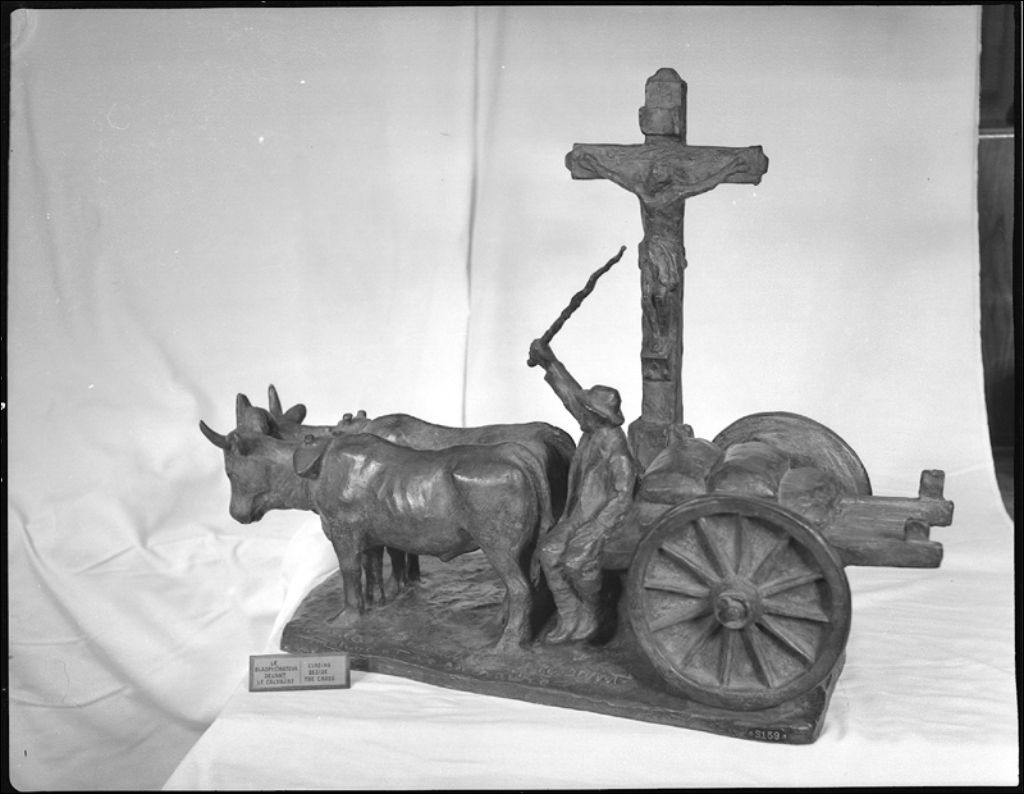 Statue en bronze d'Alfred Laliberté: «Le blasphémateur devant le calvaire», 1943, Archives nationales à Québec, Fonds Ministère de la Culture et des Communications, (03Q,E6,S7,SS1,D2,P16794), Paul Carpentier.