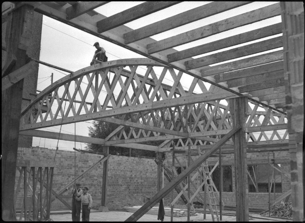 Garage station-service, structure en bois du toit, Saint-Jean, 1943, Archives nationales à Québec, Fonds Ministère de la Culture et des Communications, (03Q,E6,S7,SS1,D2,P1733), J. W. Michaud.