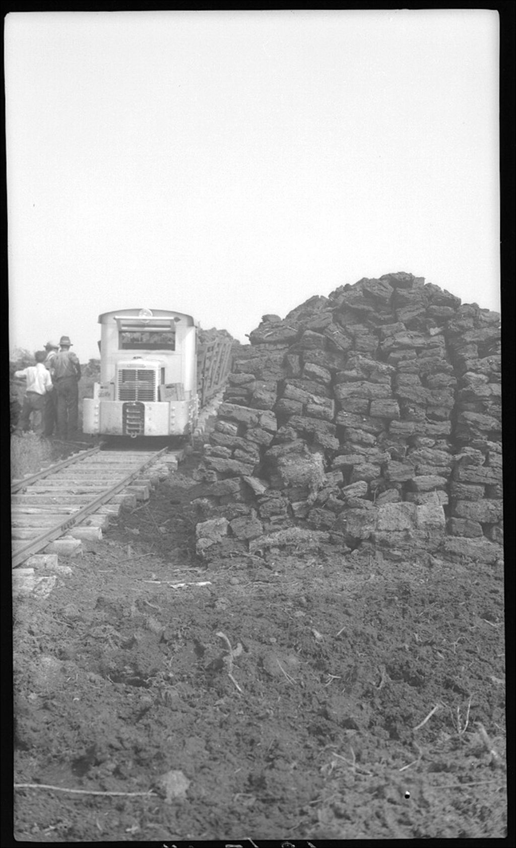 Tourbière à l'Isle-Verte: piles de tourbe et les wagons pour le transport, 1941, Archives nationales à Québec, Fonds Ministère de la Culture et des Communications, (03Q,E6,S7,SS1,D2,P1867), Henri Girard.