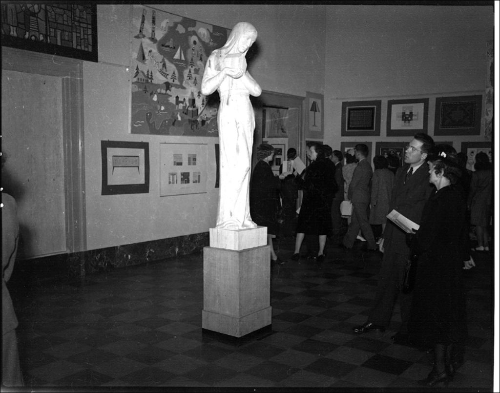 Statue en bois sculptée par Clément Paré à l'exposition de fin d'année de l'école des Beaux-Arts au Musée provincial de Québec, 1944, Archives nationales à Québec, Fonds Ministère de la Culture et des Communications, (03Q,E6,S7,SS1,D2,P19497), Neuville Bazin.