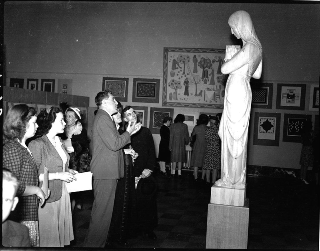 Statue en bois sculptée par Clément Paré à l'exposition de fin d'année de l'école des Beaux-Arts au Musée provincial de Québec, 1944, Archives nationales à Québec, Fonds Ministère de la Culture et des Communications, (03Q,E6,S7,SS1,D2,P19498), Neuville Bazin.