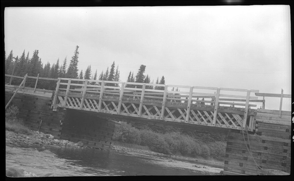 Reconstruction d'un pont à la décharge du grand lac Jacques-Cartier, 1944, Archives nationales à Québec, Fonds Ministère de la Culture et des Communications, (03Q,E6,S7,SS1,D2,P20214), J.A. Fournier.
