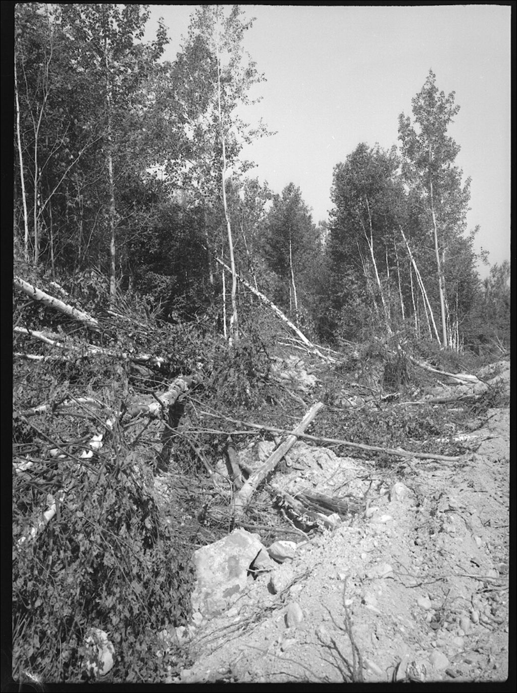 Voirie forestière de Durette et Guérette: Déchets forestiers le long de la route à Escourt, 1944, Archives nationales à Québec, Fonds Ministère de la Culture et des Communications, (03Q,E6,S7,SS1,D2,P21259), J.W. Michaud.