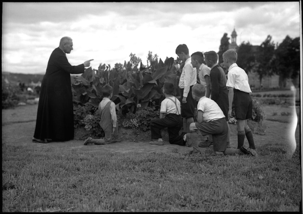Leçon au jardin scolaire par un Frère au collège Saint-Romuald