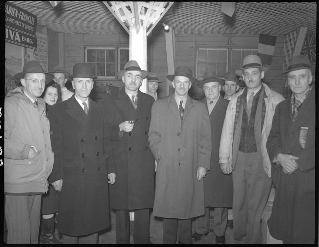 Exposition provinciale de renards en 1944. De gauche à droite : Dr J.E. Laforest, MM. Laurent Barré, Ministre de l'Agriculture, Patrice Tardif, E. St-Germain et L.J. Simard, 1944, Archives nationales à Québec, Fonds Ministère de la Culture et des Communications, (03Q,E6,S7,SS1,D2,P22923), Neuville Bazin.