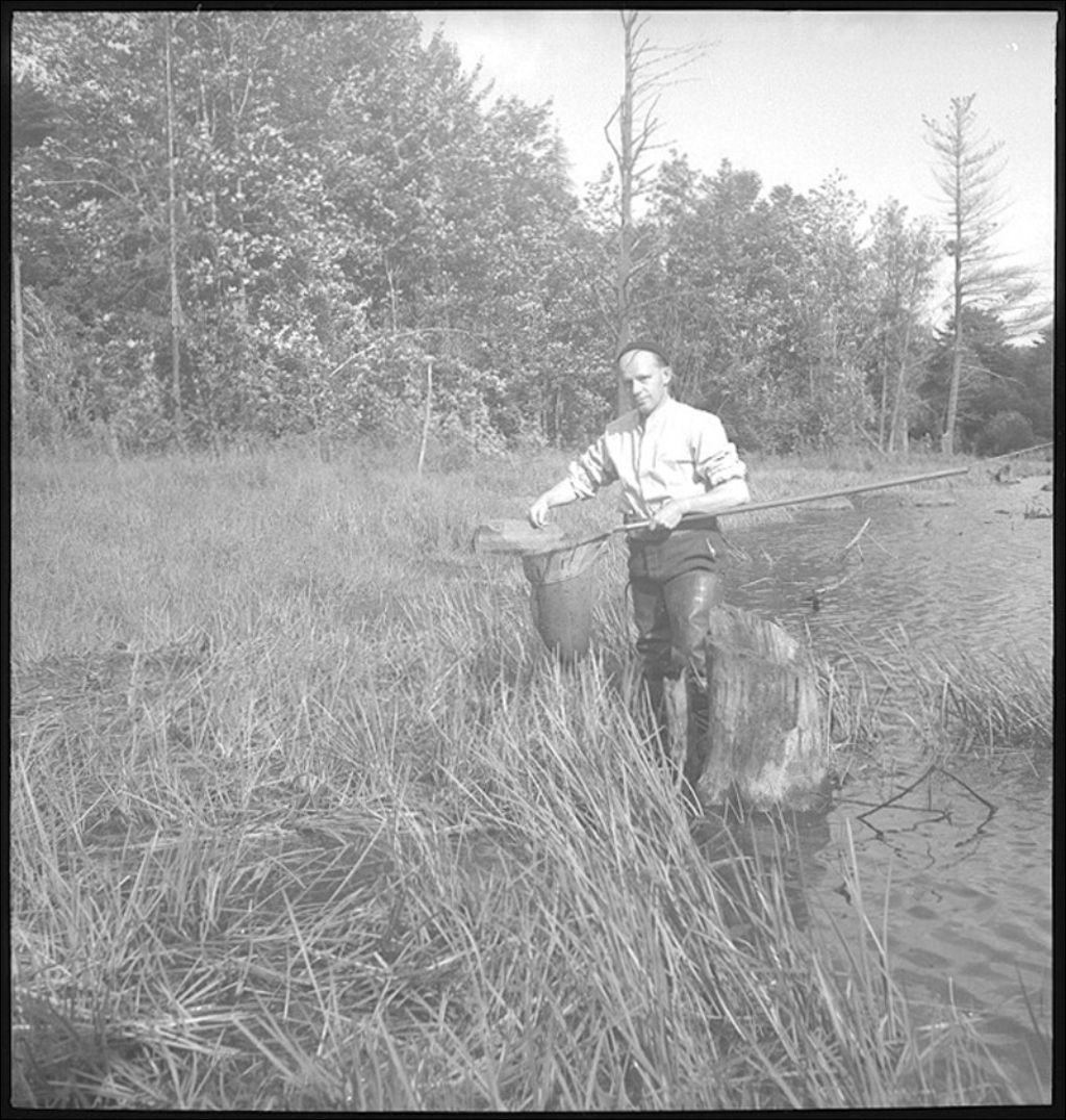 Insectes aquatiques à Charny. L'abbé Ovila Fournier, secrétaire de la faculté des sciences de Montréal, en train de capturer des insectes dans l'étang Enderson, 1944, Archives nationales à Québec, Fonds Ministère de la Culture et des Communications, (03Q,E6,S7,SS1,D2,P22940), Georges Gauthier.