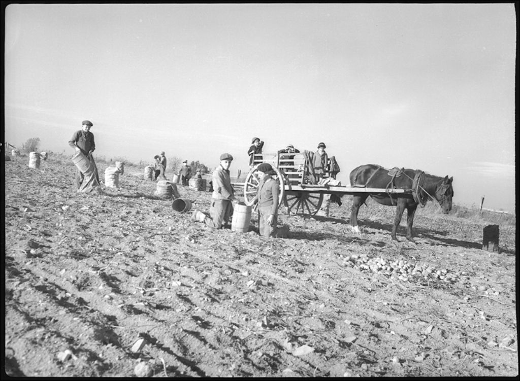 Récolte de pommes de terre sur la ferme A. Breton à Saint-Michel-de-Bellechasse, 1944, Archives nationales à Québec, Fonds Ministère de la Culture et des Communications, (03Q,E6,S7,SS1,D2,P23272), J.W. Michaud.