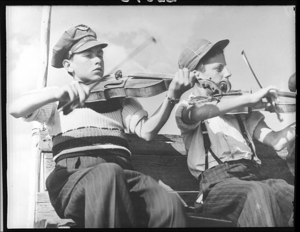 Deux jeunes violonneux de Newport à Gaspé, 1944, Archives nationales à Québec, Fonds Ministère de la Culture et des Communications, (03Q,E6,S7,SS1,D2,P23646), Herménégilde Lavoie.
