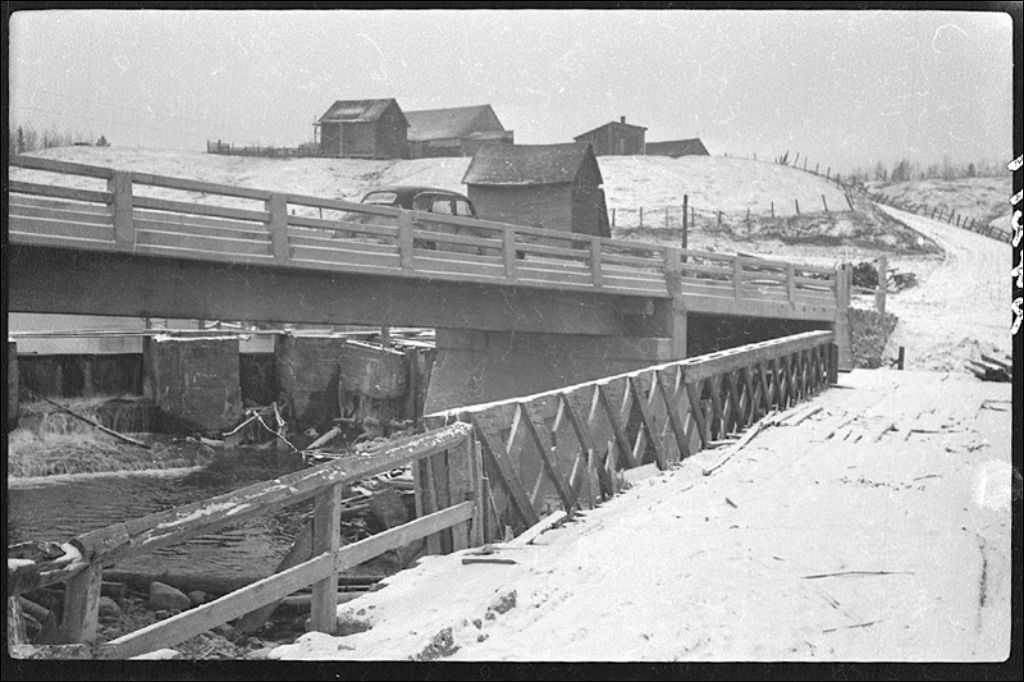 Le pont Joliette à Saint-Isidore, canton Laverlochère, Abitibi, 1944, Archives nationales à Québec, Fonds Ministère de la Culture et des Communications, (03Q,E6,S7,SS1,D2,P24219), H.C. Dupuis.