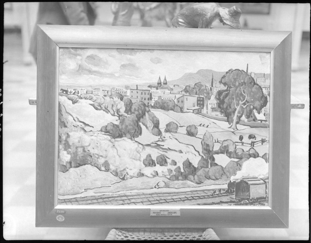 «Paysage à Hochelaga», peinture au Musée provincial de Québec, 1945, Archives nationales à Québec, Fonds Ministère de la Culture et des Communications, (03Q,E6,S7,SS1,D2,P24725), Neuville Bazin.