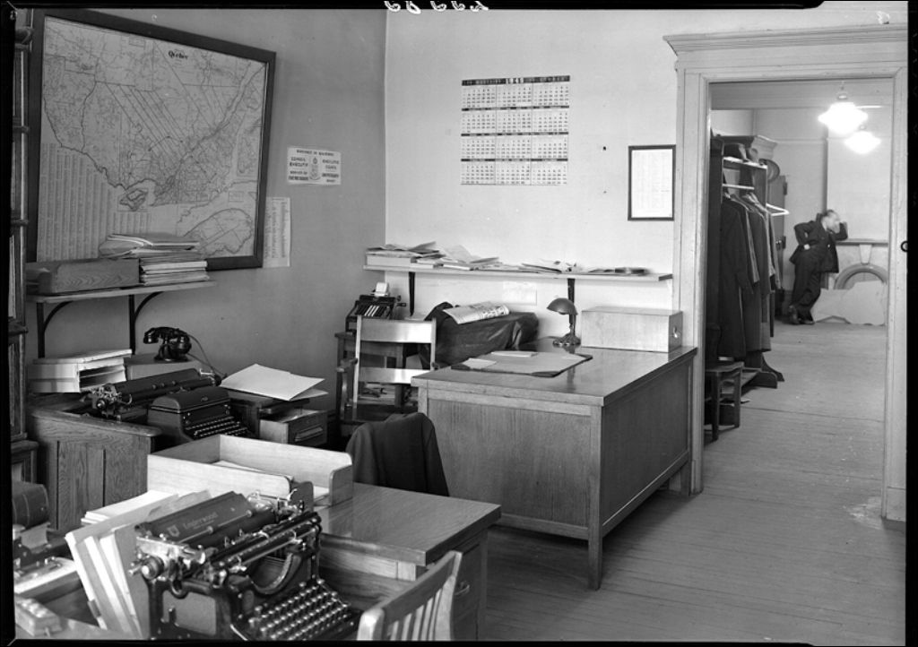 Bureau de M. Alphonse Proulx en charge de la cinémathèque, 1945, Archives nationales à Québec, Fonds Ministère de la Culture et des Communications, (03Q,E6,S7,SS1,D2,P25585), Neuville Bazin.