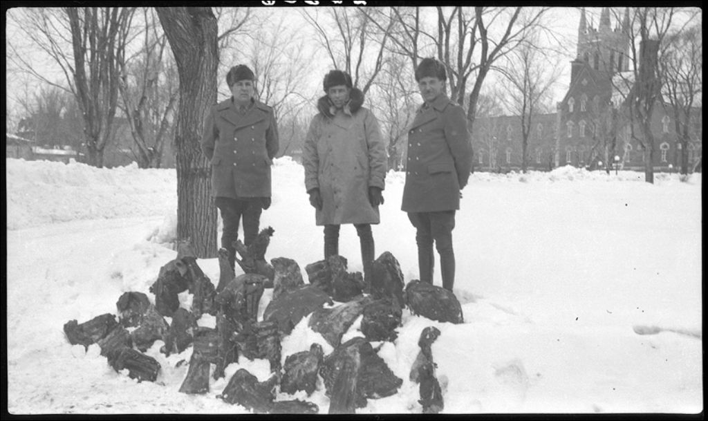 Saisie de viande d'orignaux à Linton, comté de Portneuf, par les officiers Adrien Lapointe, Ovila Bolduc, de Québec, et Oscar Lirette de Saint-Raymond, 1945, Archives nationales à Québec, Fonds Ministère de la Culture et des Communications, (03Q,E6,S7,SS1,D2,P25606), J. Armand Lapointe.