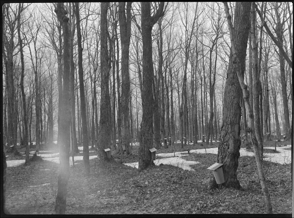 Érablière en opération à Saint-Henri de Lévis, 1945, Archives nationales à Québec, Fonds Ministère de la Culture et des Communications, (03Q,E6,S7,SS1,D2,P25717), J.W. Michaud.