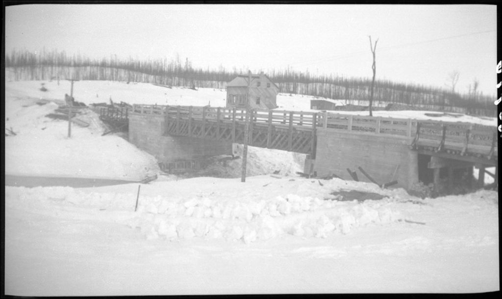 Pont sur la rivière Colombier, comté de Saguenay, 1945, Archives nationales à Québec, Fonds Ministère de la Culture et des Communications, (03Q,E6,S7,SS1,D2,P25796), Albert Roy.