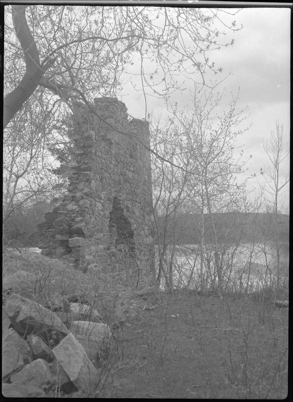 Ruines de la vieille scierie Atkinson sur la rivière Etchemin, Saint-Romuald, 1945, Archives nationales à Québec, Fonds Ministère de la Culture et des Communications, (03Q,E6,S7,SS1,D2,P25902), J.W. Michaud.