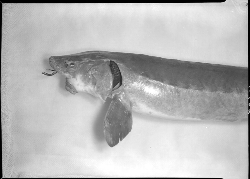 Gros esturgeon jaune pris à Saint-Vallier, 1945, Archives nationales à Québec, Fonds Ministère de la Culture et des Communications, (03Q,E6,S7,SS1,D2,P25941), Raymond Audet; Vladykov.