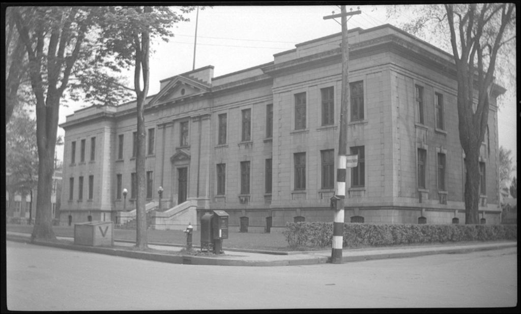 Façade principale du Palais de justice à Trois-Rivières, 1945, Archives nationales à Québec, Fonds Ministère de la Culture et des Communications, (03Q,E6,S7,SS1,D2,P26061), L. Fontaine.