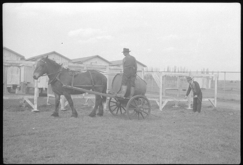 Désinfection à la ferme-école de Courville, 1945, Archives nationales à Québec, Fonds Ministère de la Culture et des Communications, (03Q,E6,S7,SS1,D2,P26105), L. Beaudet.