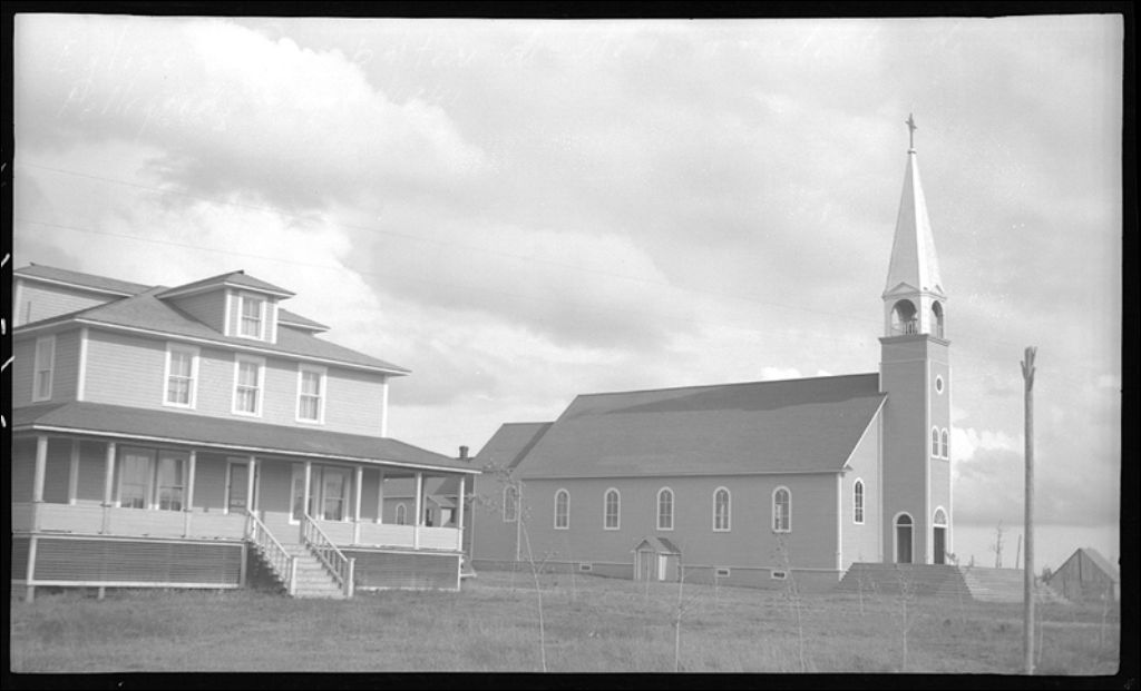 Presbytère et église de Sainte-Bernadette-de-Pellegrin, 1941, Archives nationales à Québec, Fonds Ministère de la Culture et des Communications, (03Q,E6,S7,SS1,D2,P2634), Eugène Gagné.