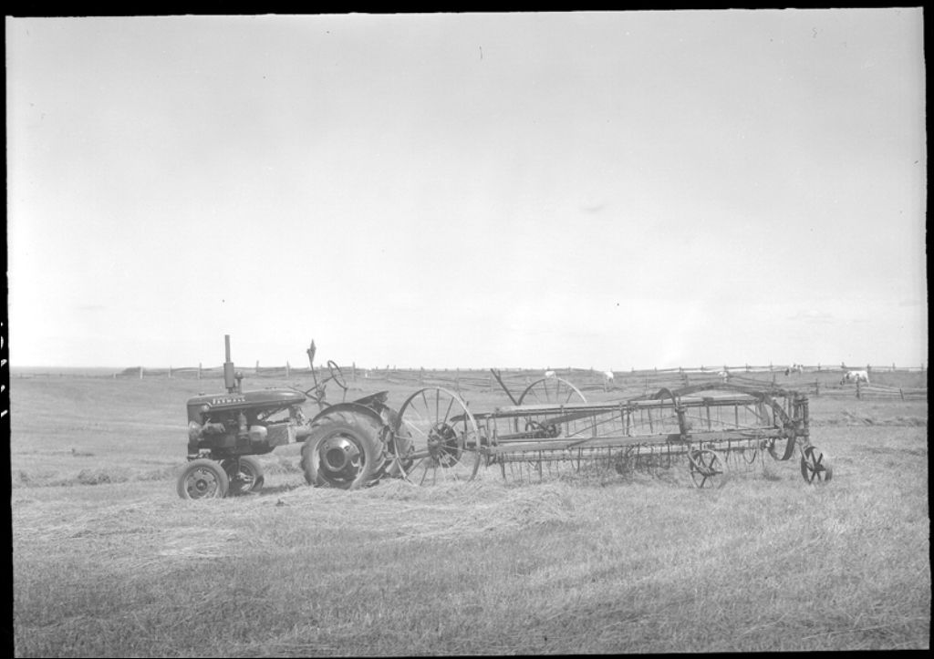 Tracteur et râteau à décharge latérale à Laurierville, 1945, Archives nationales à Québec, Fonds Ministère de la Culture et des Communications, (03Q,E6,S7,SS1,D2,P26719), Roland L'Espérance.