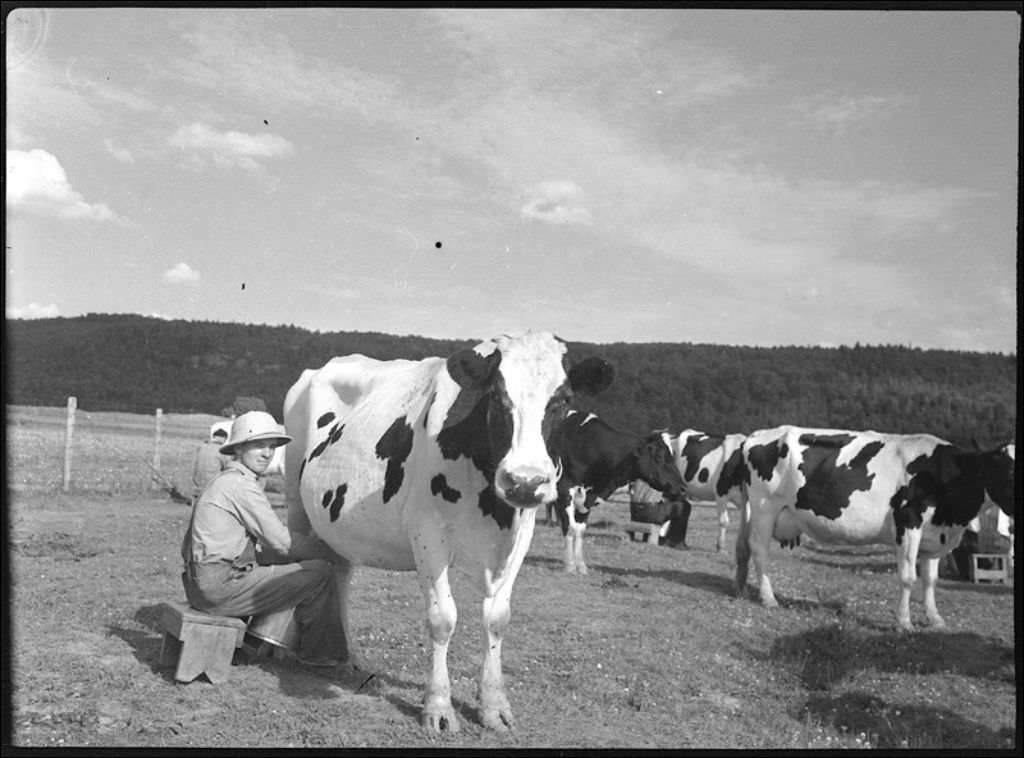 Troupeau de vaches Holstein à Saint-Pierre-de-Montmagny, 1945, Archives nationales à Québec, Fonds Ministère de la Culture et des Communications, (03Q,E6,S7,SS1,D2,P26726), J.W. Michaud.
