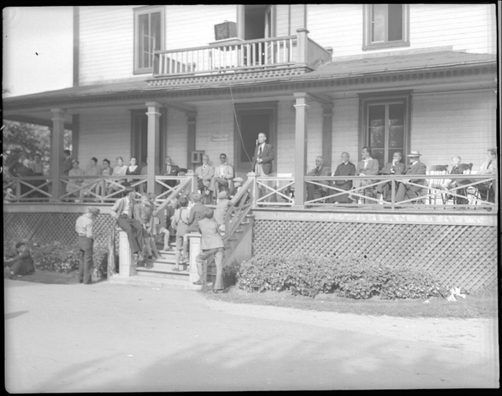 Pique-nique annuel des éleveurs à la ferme-école provinciale de Deschambault. Andréa St-Pierre s'adresse à l'assistance. Sur la galerie, les invités spéciaux: Laurent Barré, Dr Pierre Gauthier et autres.