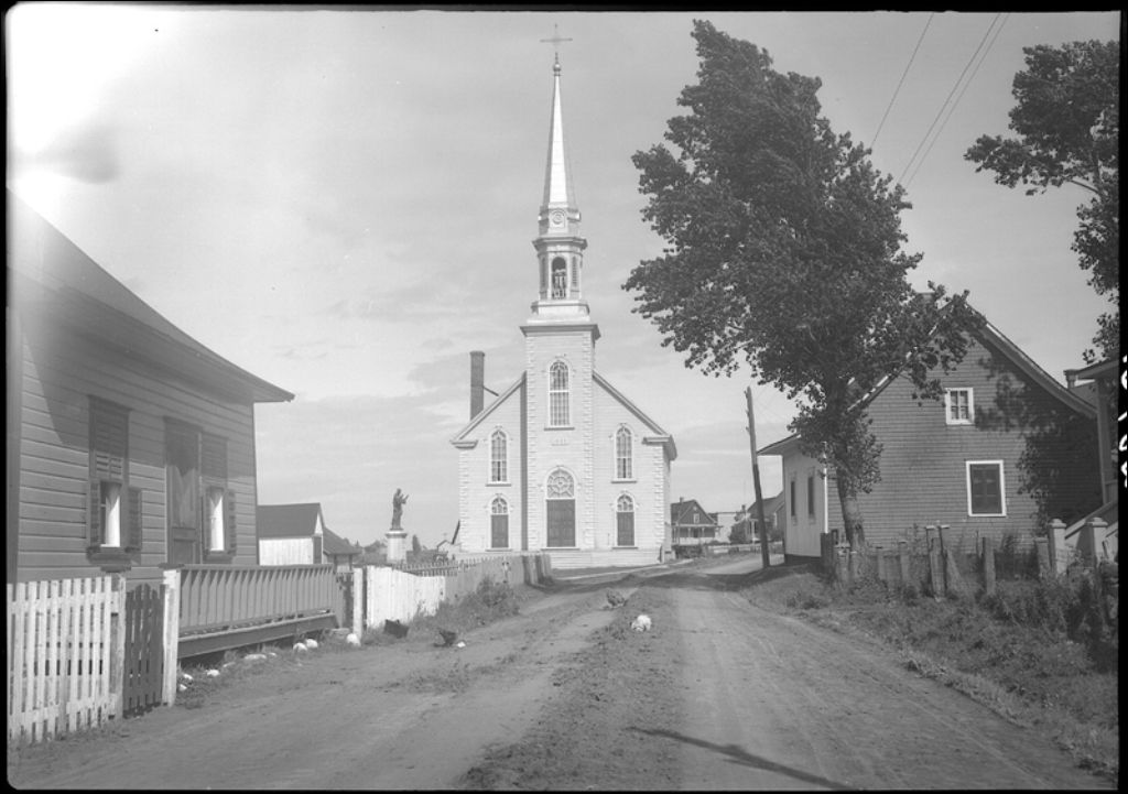 L'église et le village de l'Isle-aux-Grues, 1945, Archives nationales à Québec, Fonds Ministère de la Culture et des Communications, (03Q,E6,S7,SS1,D2,P28131), J.B. Potvin.